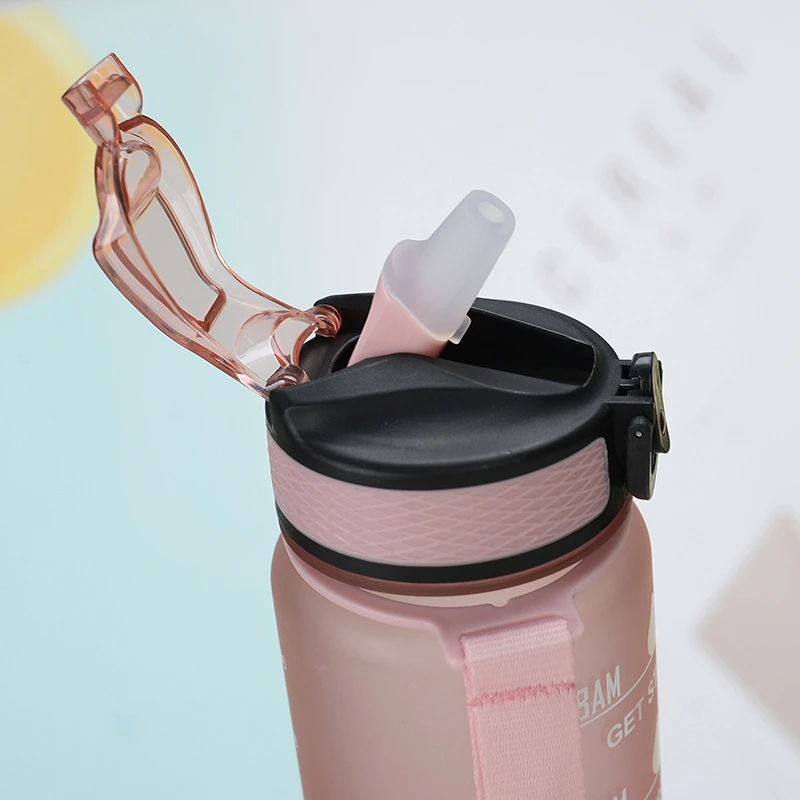 The flip top lid is designed with a secure lock, making it dust and leak proof. Simply open with one hand by clicking the button. Feature with a silicone straw which allows you to enjoy spill-proof sipping. With a portable strap and carry loop handle it is easy for clip-on and on-the-go hydration. The mouth is wide enough to fit ice cubes, also easy to clean.