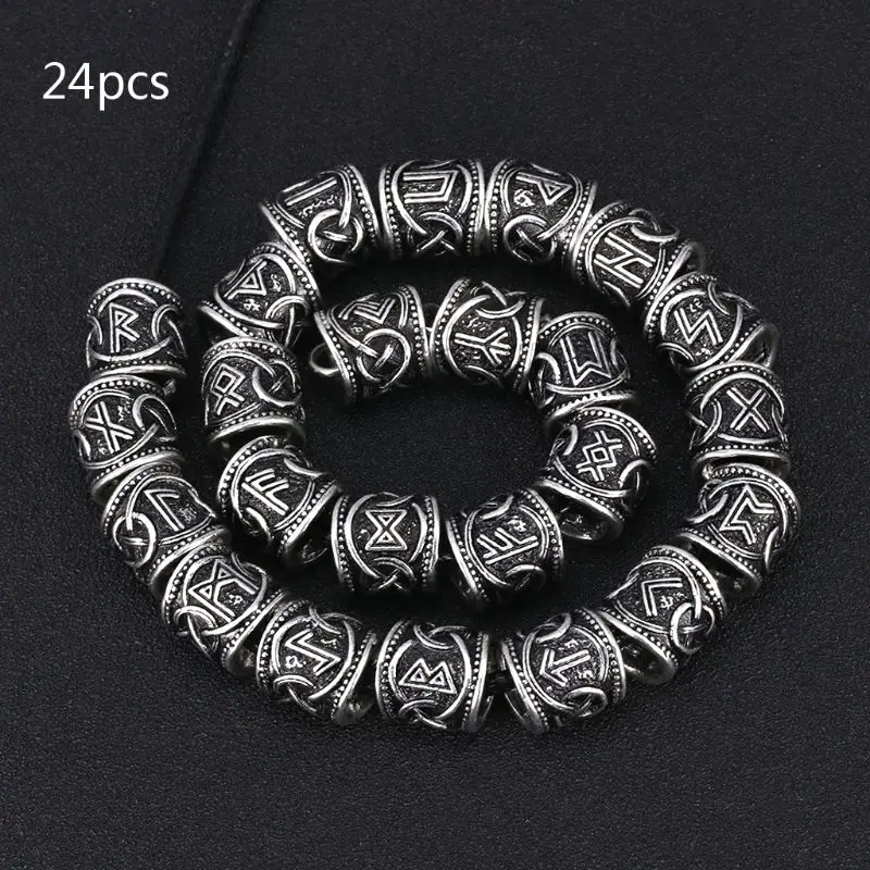 24Pcs Vintage Silver West Coast Paracord Norse Viking Rune Metal Beads DIY Antique Bracelet Hair Beards Jewelry Making