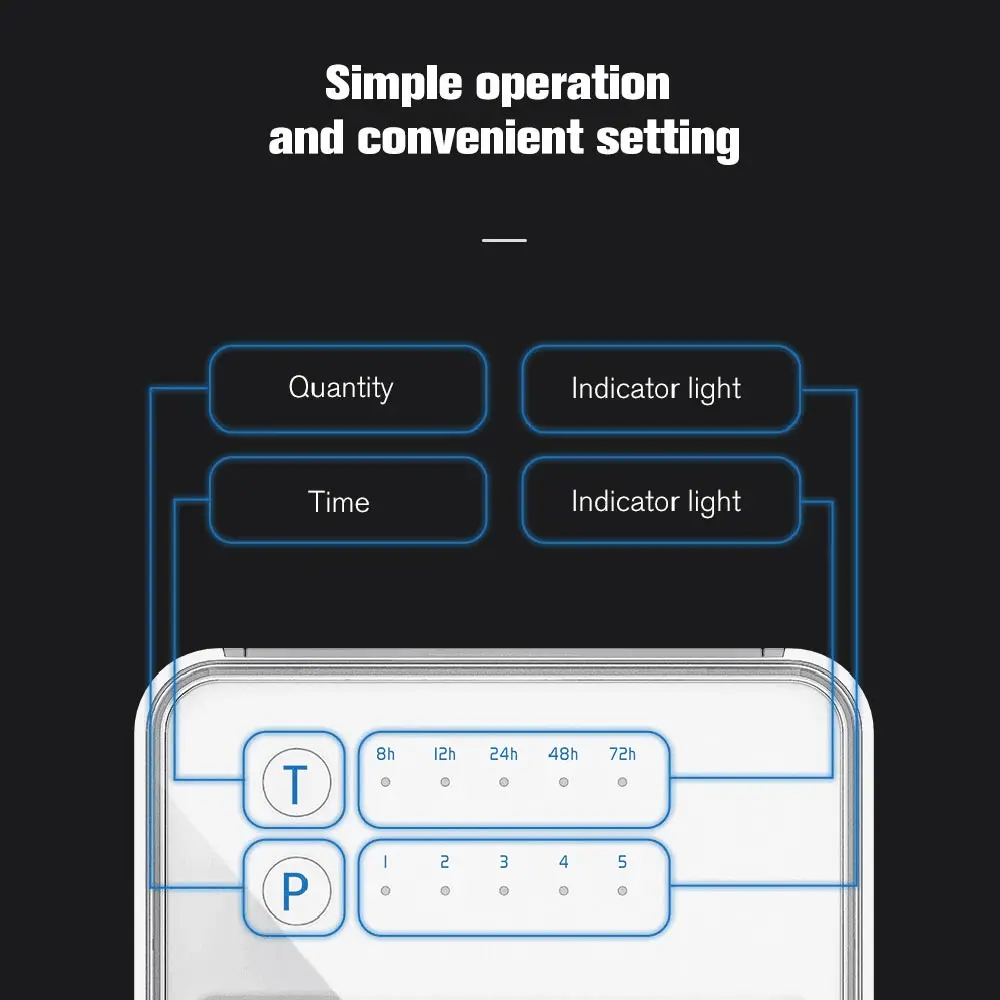 Simple operation and convenient setting. At the top is a transparent bucket with a clear surplus so you know when to put fish food.